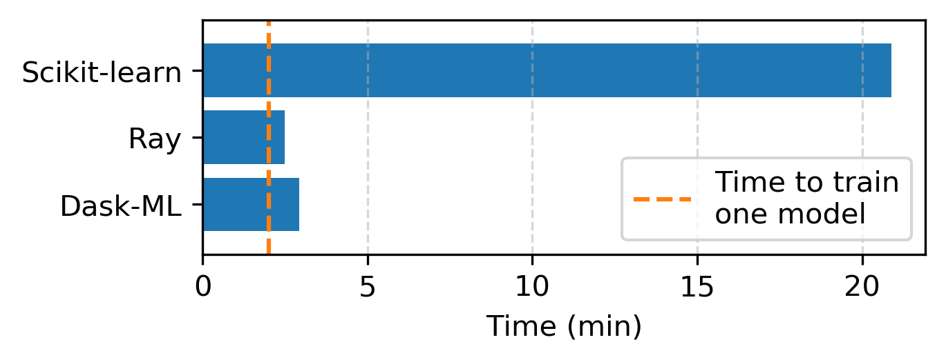 Clearly, Ray and Dask-ML offer similar performance for 8 workers when compared with Scikit-Learn. To Ray’s credit, their implementation is ~15% faster than Dask-ML’s with 8 workers. We suspect that this performance boost comes from the fact that Ray implements an asynchronous variant of Hyperband. We should investigate this difference between Dask and Ray, and how each balances the tradeoffs, number FLOPs vs. time-to-solution. This will vary with the number of workers: the asynchronous variant of Hyperband provides no benefit if used with a single worker.